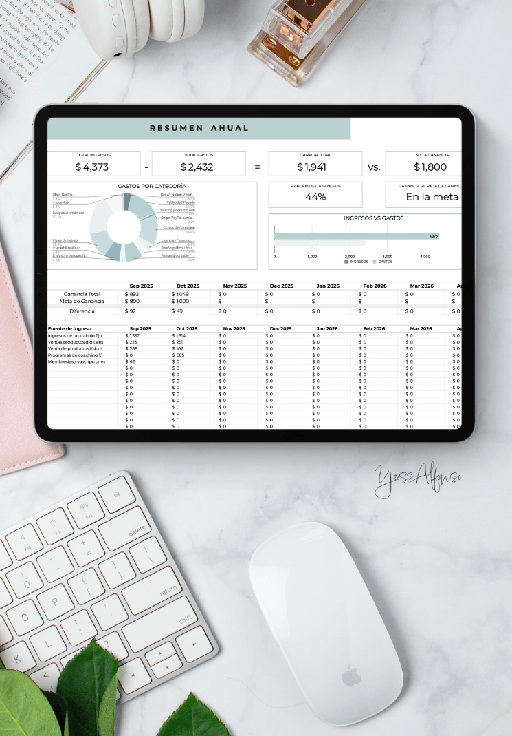 Así nació esta plantilla de Finanzas de Negocios, creada para ayudarte a organizar cada ingreso y gasto, ver con sencillez tu rentabilidad y planificar con estrategia. Porque mereces que tu negocio te dé libertad, no dolores de cabeza.